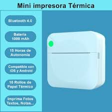 Imprimante portable thermique idéale pour imprimer photos, textes et notes. Compatible iOS et Android, autonomie de 15 heures. Livrée avec 16 rouleaux de papier thermique.