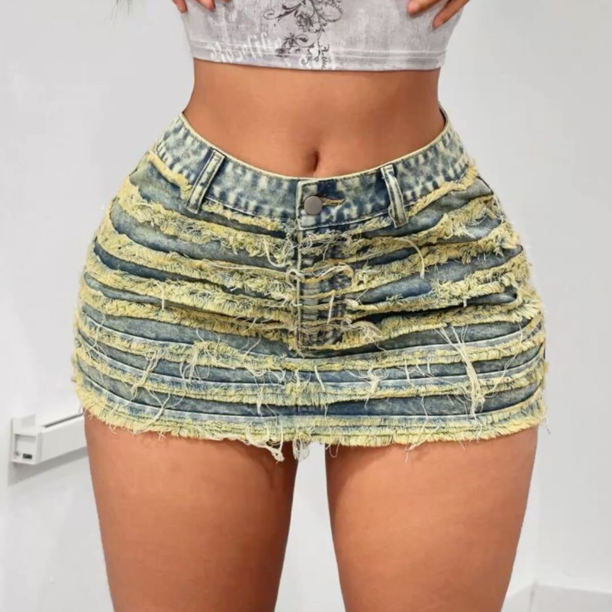 Découvrez cette jupe courte en jean déchiré, parfaite pour un look décontracté et tendance. Conçue en denim de qualité, elle offre une coupe ajustée et un style unique avec ses déchirures. Idéale pour les sorties entre amis ou les journées décontractées.