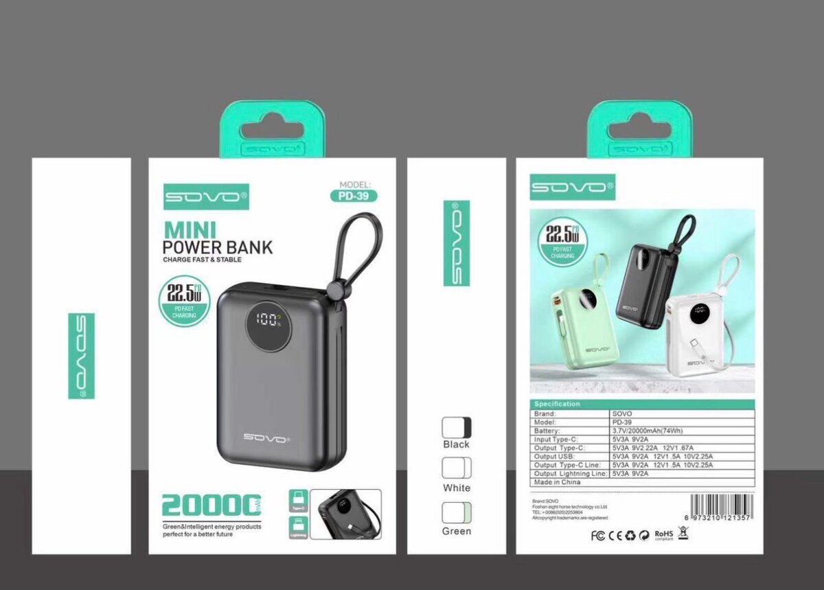 Chargez rapidement et facilement avec cette batterie externe compacte de 20000mAh. Parfaite pour voyager, elle offre une solution puissante pour garder vos appareils chargés. Disponible en noir, blanc et vert.