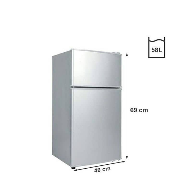 Mini réfrigérateur compact et silencieux, idéal pour les petits espaces. 58L de capacité, dimensions: 69cm x 40cm. Parfait pour chambre, bureau ou cuisine.