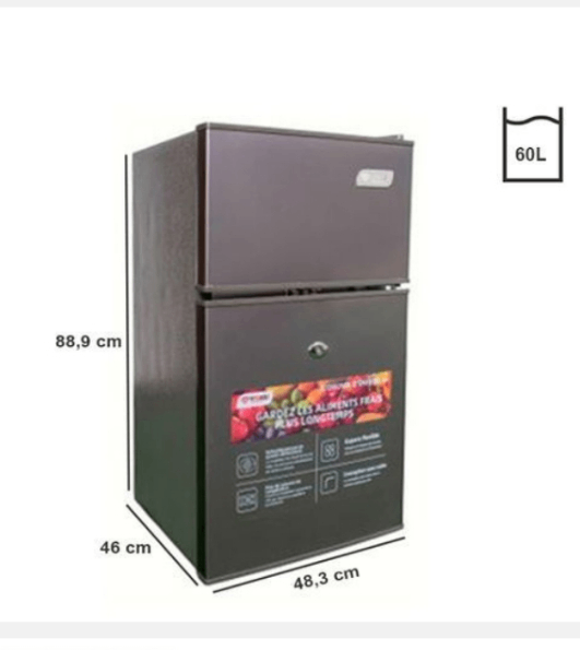 Mini réfrigérateur compact de 60L, idéal pour les petits espaces. Parfait pour les dortoirs, bureaux ou chambres d'hôtel. Économe en énergie et silencieux. Dimensions : 88,9 x 48,3 x 46 cm.