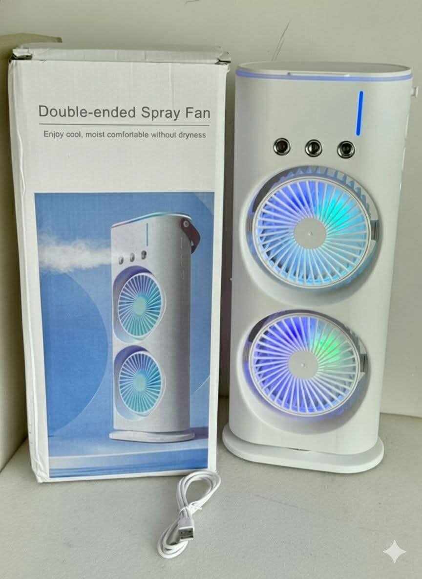 Rafraîchissez votre espace avec notre mini ventilateur brumisateur double face. Portable et élégant, il est idéal pour le bureau ou la chambre. Fonctionne avec une alimentation électrique et dispose d'une fonction de pulvérisation d'eau pour un confort optimal.