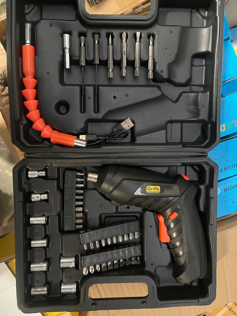 Un kit complet incluant un mini perceuse électrique 18V Grifa avec accessoires, idéal pour les travaux de bricolage et de réparation. Contient des embouts et une valise de rangement.