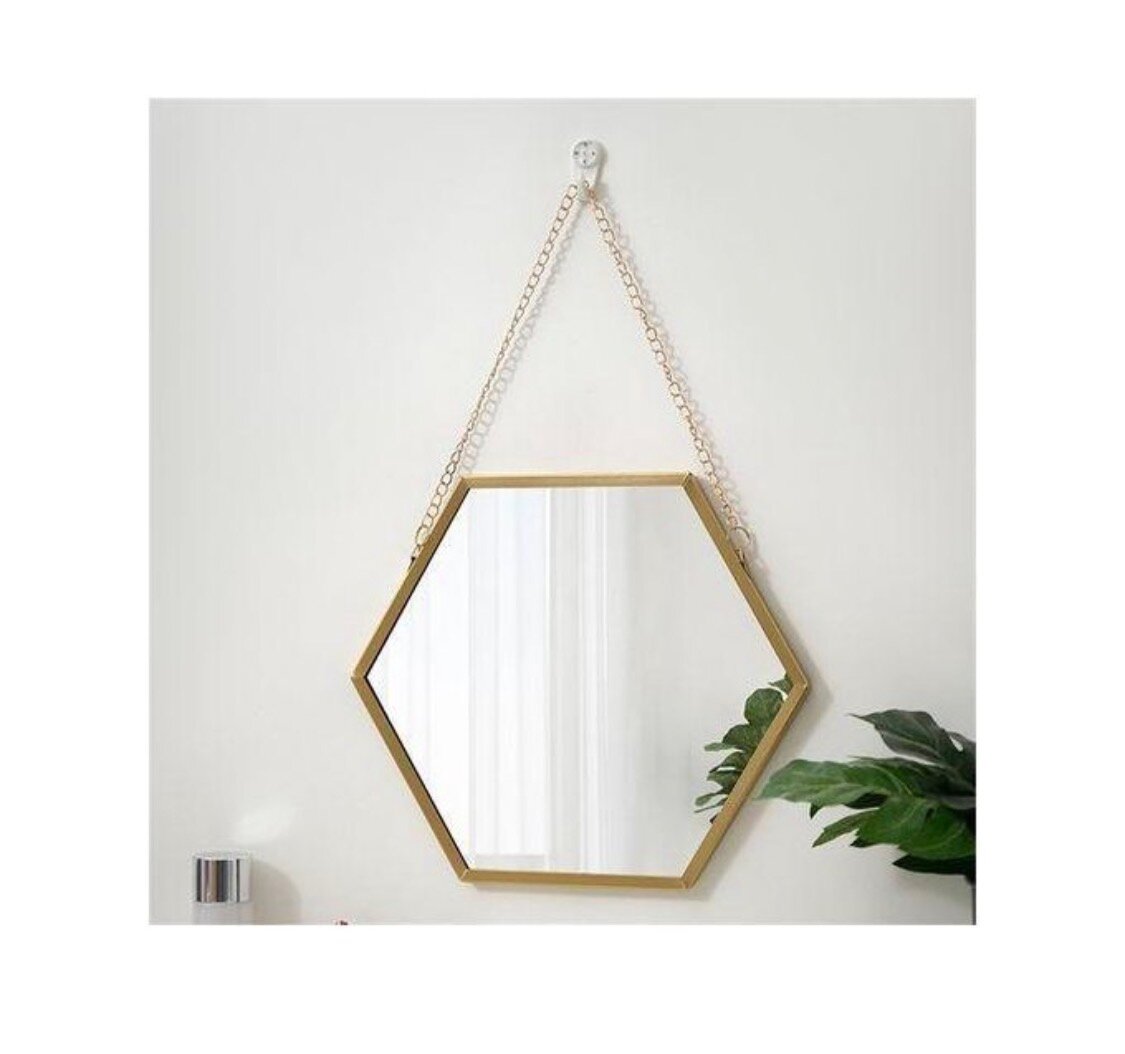 Ajoutez une touche de modernité à votre intérieur avec ce miroir hexagonal mural en métal doré. Suspendu par des chaînes élégantes, il mesure 30 cm de largeur et 26 cm de hauteur. Parfait pour les pièces modernes et minimalistes.