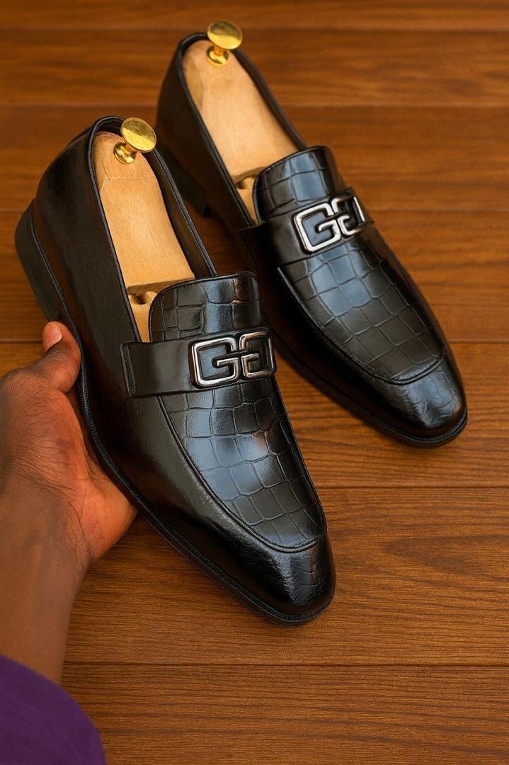Découvrez ces mocassins en cuir noir pour homme avec finition texturée et détail métallique sophistiqué. Parfaits pour une occasion formelle ou pour ajouter une touche élégante à votre tenue quotidienne.