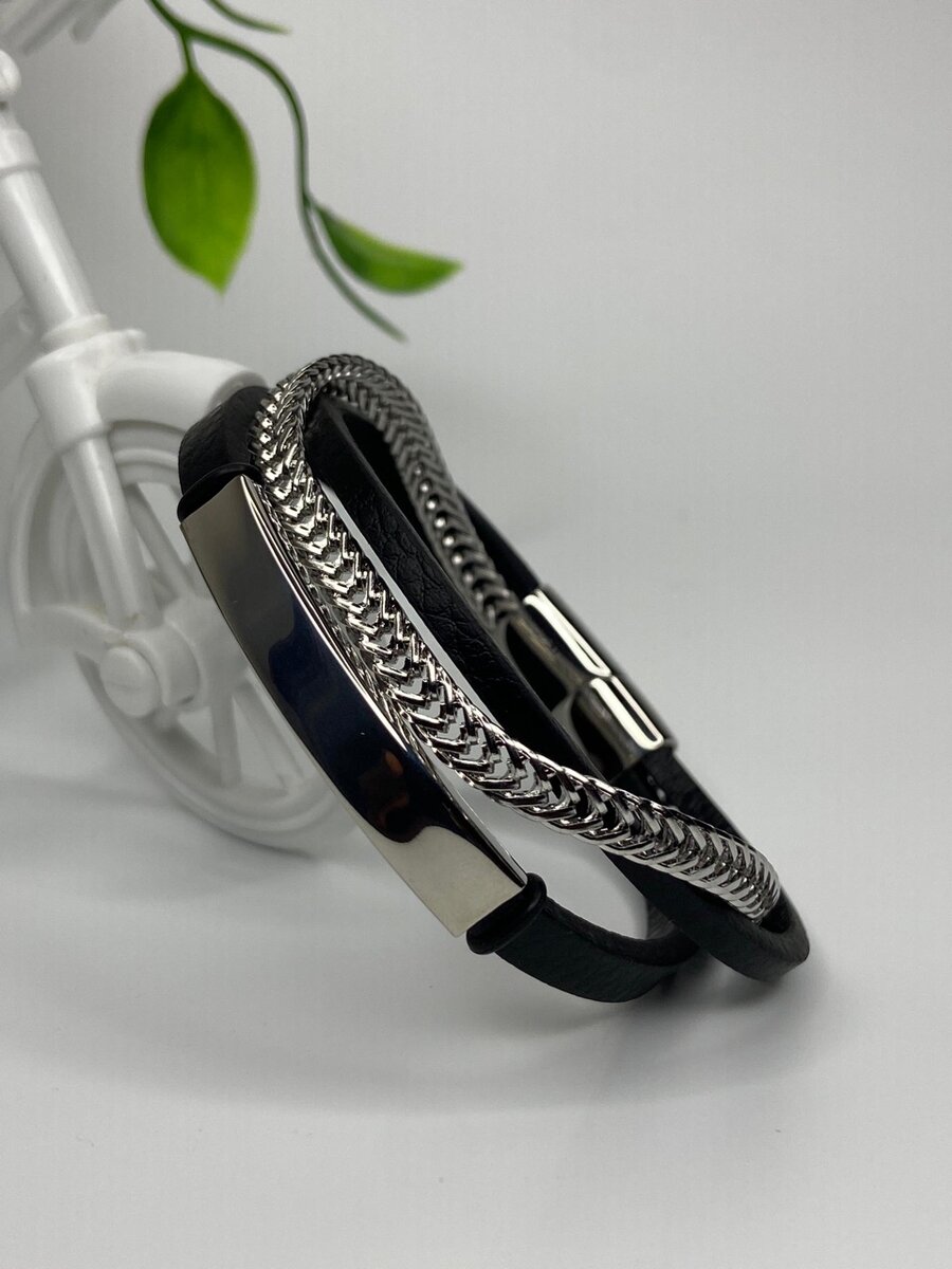 Durable black leather paired with polished steel links for a bold yet sophisticated look.