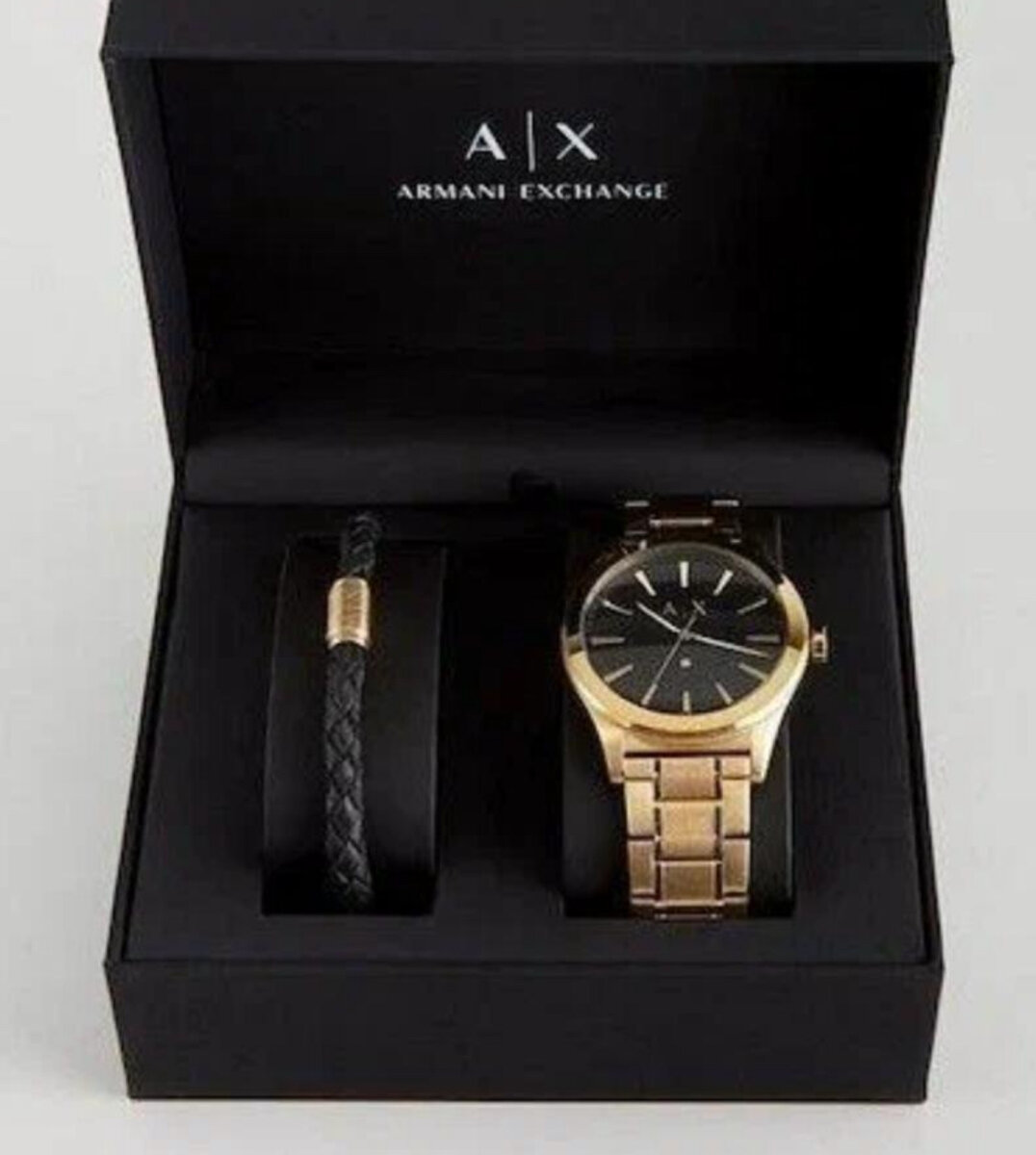 Ensemble élégant comprenant une montre Armani Exchange dorée avec bracelet en métal et un bracelet en cuir noir. Un cadeau idéal pour les hommes qui apprécient le luxe et le style.