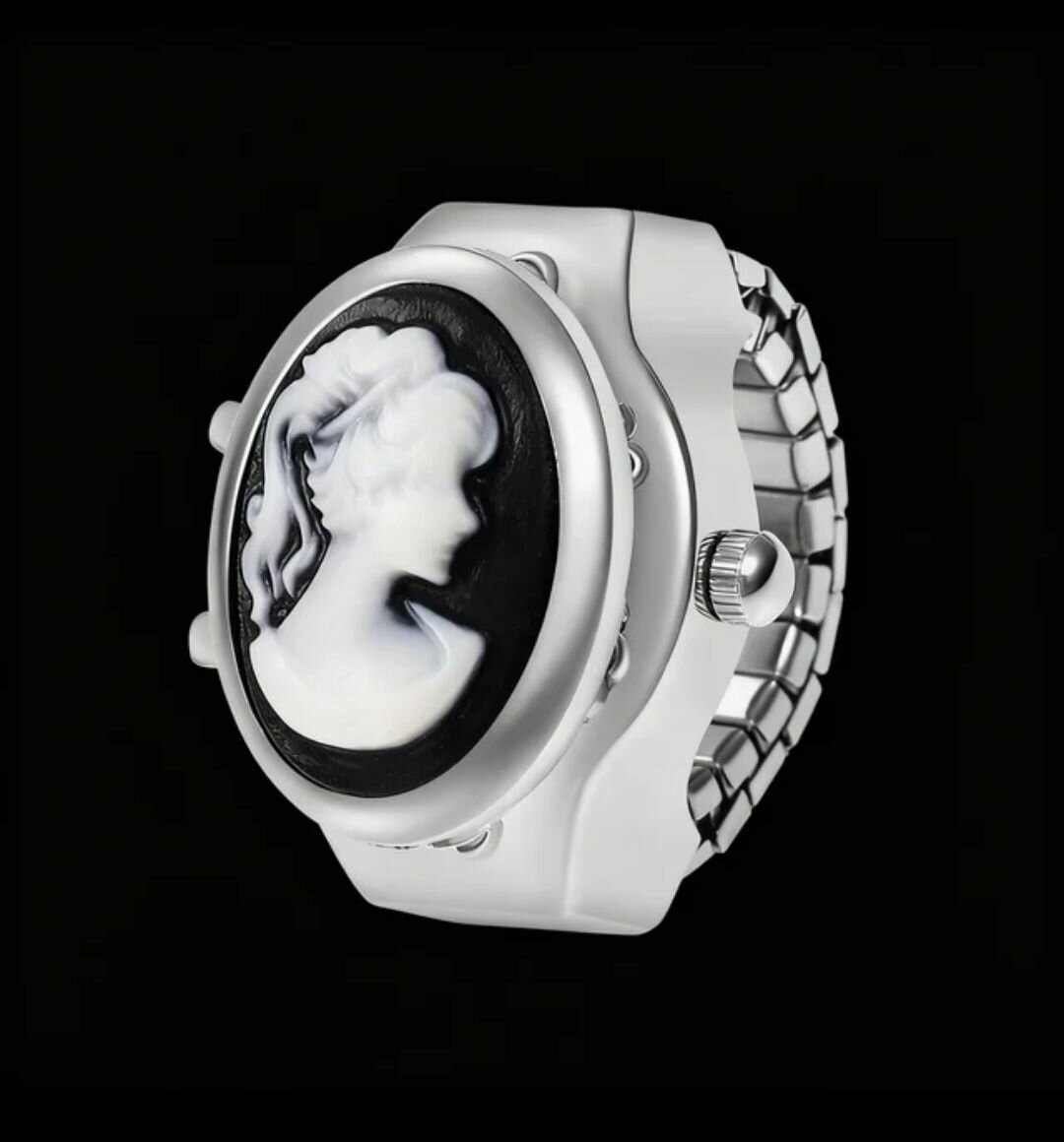 Élégante montre blanche ornée d'un camee noir et blanc représentant une femme, parfaite pour les amateurs de bijoux uniques et de style classique.