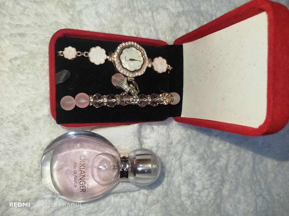Montre avec bracelet accompagné d'un parfums Dixianger ( parfums qui illumine le corps avec mes brillant à l'intérieur avec un très bon senteur)