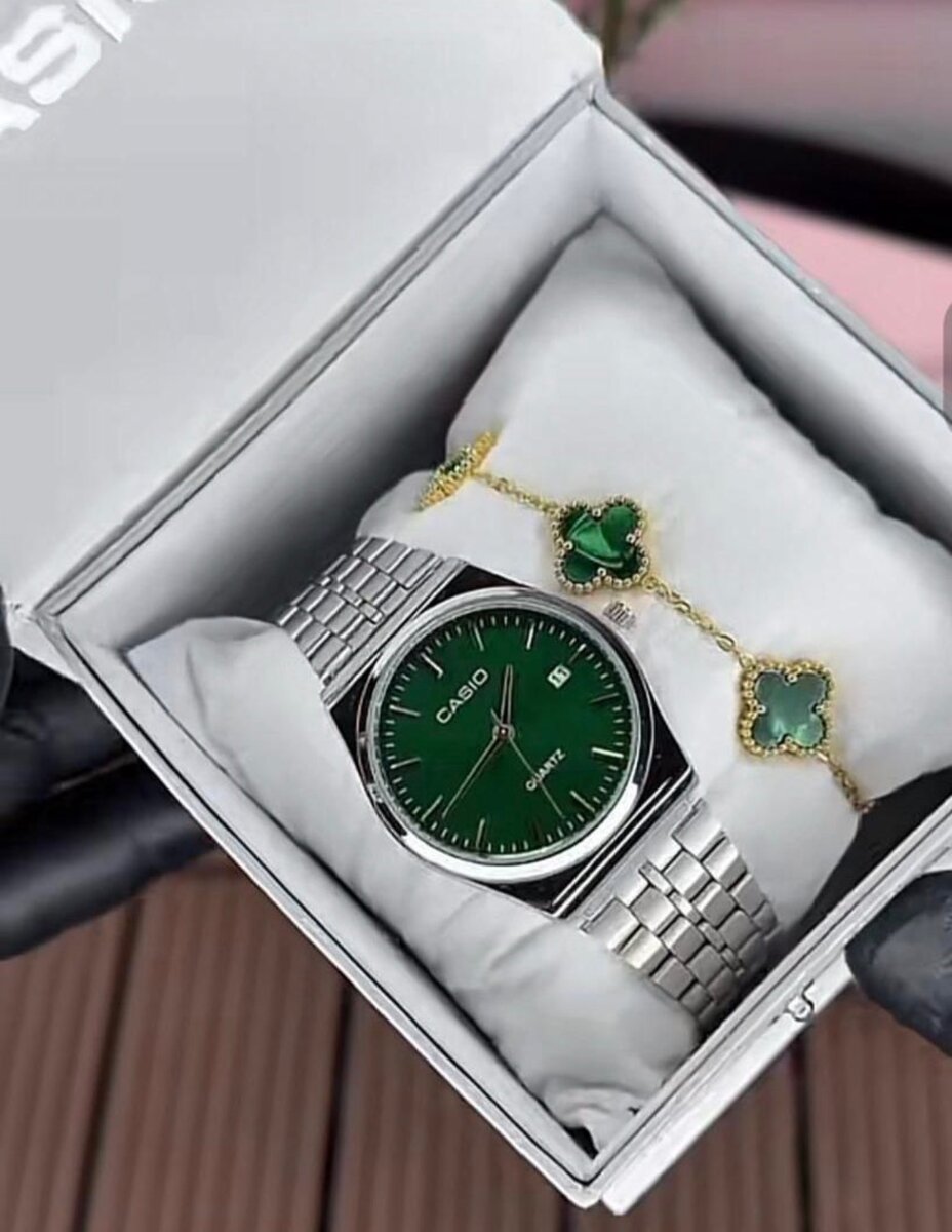Ensemble élégant de montre CASIO pour femme avec bracelet en acier et ornement en or. Parfait pour les occasions spéciales ou comme cadeau.