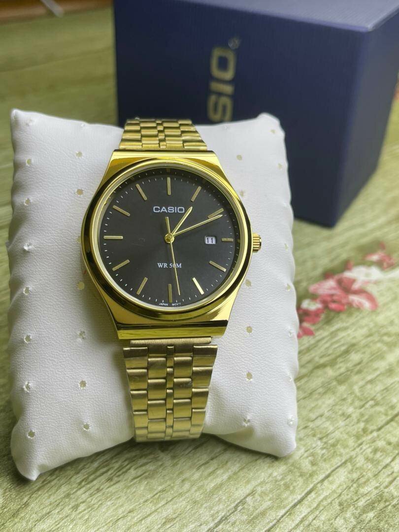 Élégante montre Casio dorée pour homme, étanche 50M, bracelet métallique chic et durable. Parfaite pour toutes les occasions.