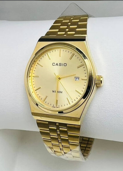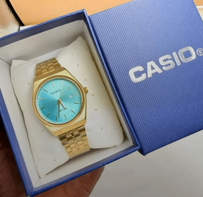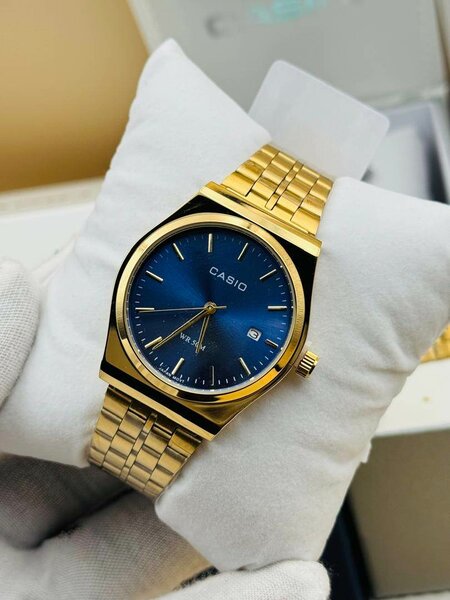 Élégante montre Casio avec bracelet en métal doré et cadran bleu. Parfaite pour les occasions spéciales ou le quotidien.