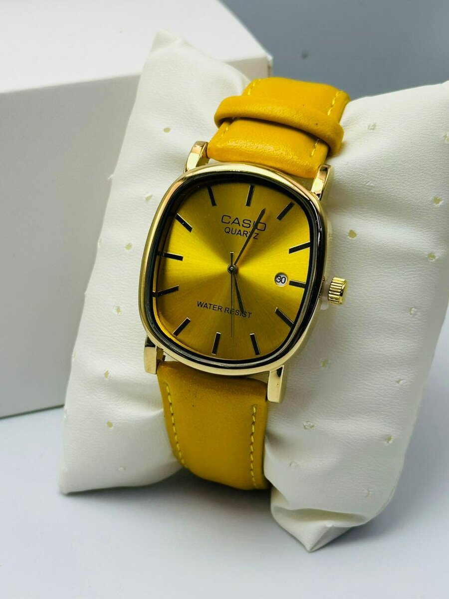 Élégante montre femme CASIO en cuir jaune avec un cadran doré. Design moderne et étanche, parfait pour toutes occasions.