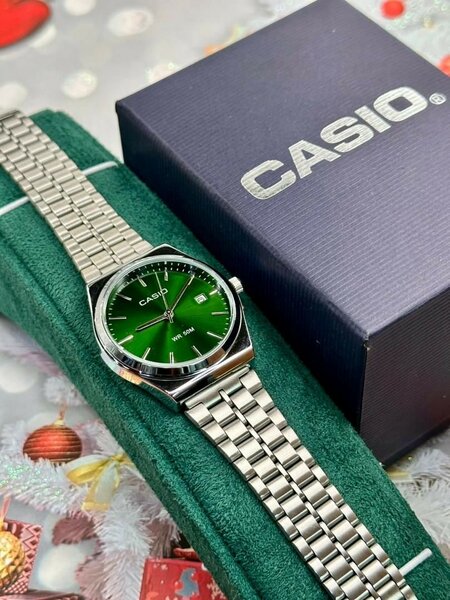 Montre Casio en acier avec cadran vert, élégante et résistante à l'eau. Idéale pour un look moderne et décontracté. Fourni avec boîte d'origine.
