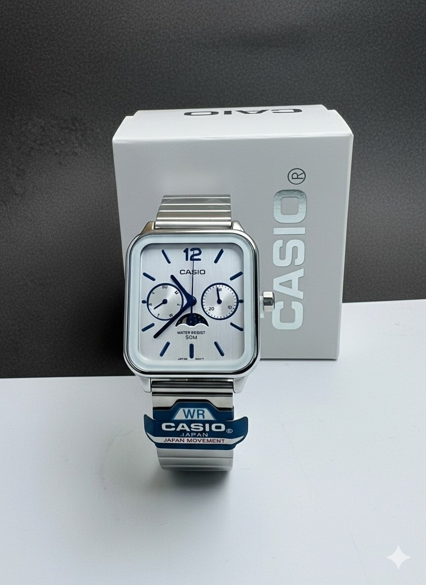 Affichage analogique avec deux sous-cadrans et indicateur de phase de lune.
