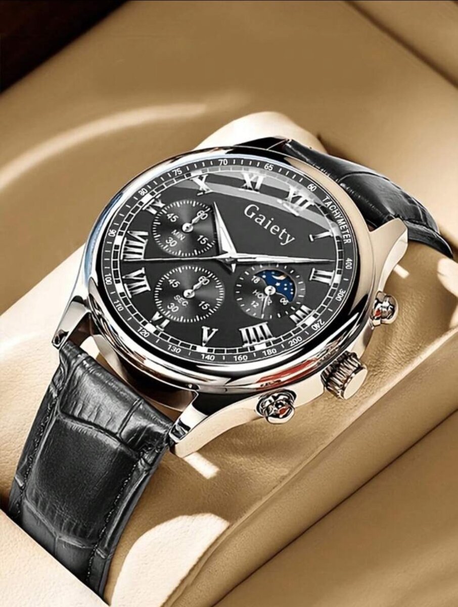 Découvrez la montre chronographe élégante, parfaite pour l'homme moderne. Avec son bracelet en cuir noir et son cadran sophistiqué, elle ajoute une touche d'élégance à votre tenue. Idéale pour le bureau ou les occasions spéciales.