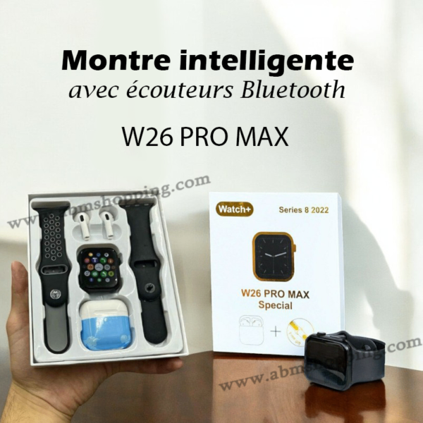 Découvrez la montre connectée W26 PRO MAX avec écouteurs Bluetooth inclus. Suivi d'activité, notifications en temps réel et design élégant. Parfait pour le sport et la vie quotidienne. Compatibilité universelle et confort exceptionnel. Idéal pour les amateurs de technologie!