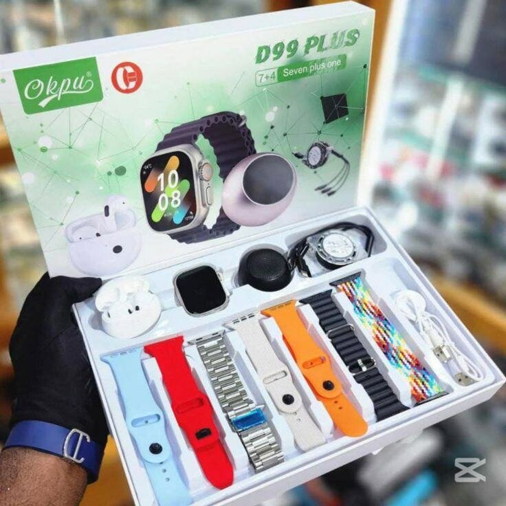 Découvrez la montre connectée D99 PLUS 7+1 avec plusieurs bracelets interchangeables. Un kit complet pour une personnalisation maximale. Étanche et compatible avec divers styles.