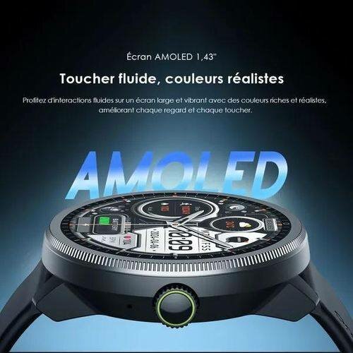 Découvrez la montre connectée avec écran AMOLED 1,43" offrant des couleurs réalistes et une navigation fluide. Profitez des appels HD sans fil directement depuis votre poignet. Idéale pour rester connecté avec élégance.
