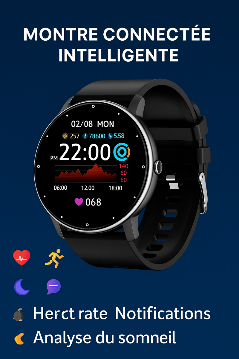 Élégante montre intelligente avec suivi du rythme cardiaque, analyse du sommeil et notifications. Compatible Android & iPhone, idéale pour le sport et la santé.