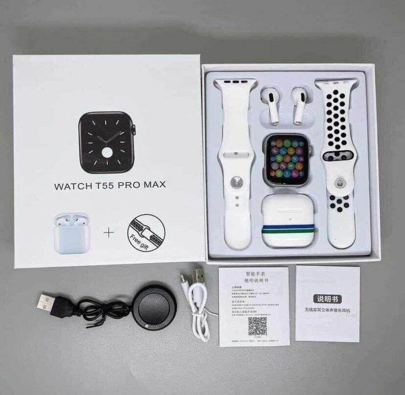 Découvrez la Montre Connectée T55 Pro Max : un design élégant avec bracelet interchangeable, écouteurs inclus, et chargement facile. Parfaite pour suivre votre activité et rester connecté. Idéale pour un usage quotidien, au sport ou au travail !