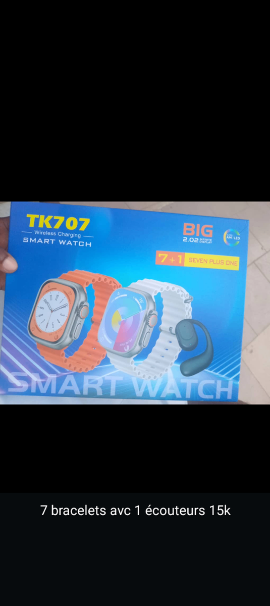 Découvrez la montre intelligente TK707 avec 7 bracelets interchangeables et écouteurs inclus. Idéale pour suivre votre activité, elle offre un design moderne et des fonctionnalités avancées pour rester connecté partout. Parfaite pour le quotidien ou le sport, elle s'adapte à toutes vos tenues.