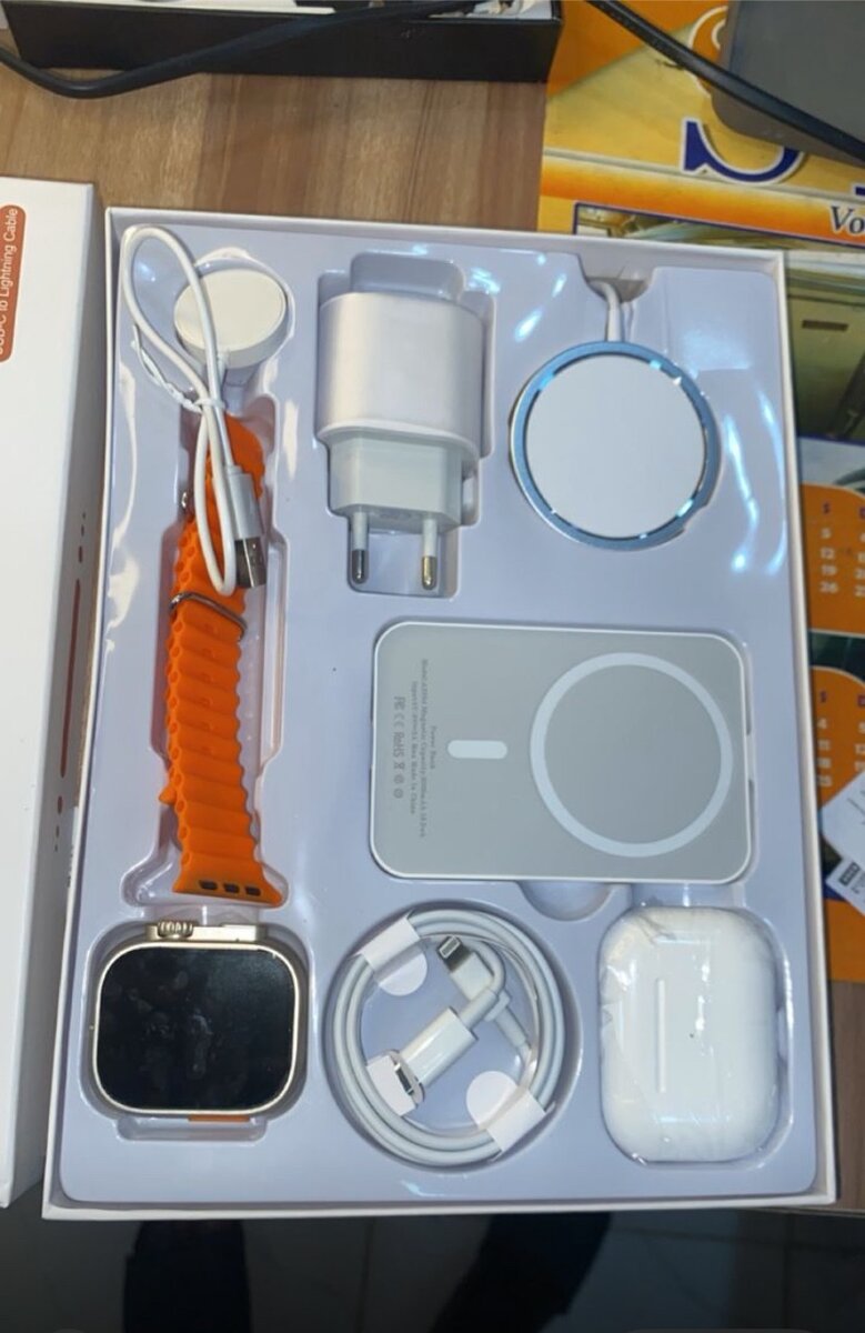 Découvrez la montre connectée X8 au bracelet orange audacieux, accompagnée d'écouteurs sans fil pour une expérience audio complète. Grâce à sa connectivité Bluetooth et son chargeur magnétique, elle offre une utilisation pratique et moderne. Parfaite pour les amateurs de technologie à la recherche de style et de fonctionnalité.