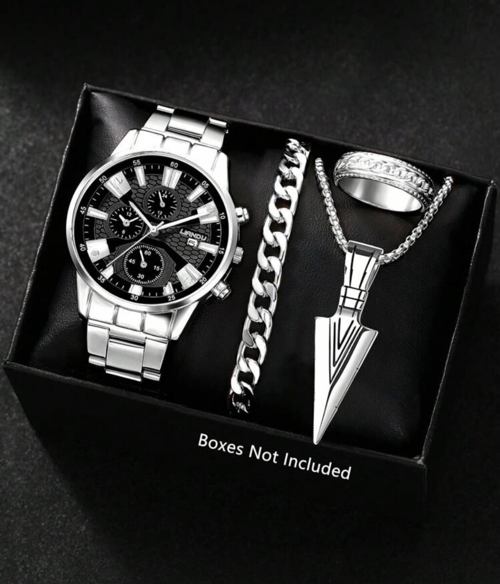 4 pièces Ensemble de montres à quartz mode pour hommes avec fonction calendrier, boîtier et bracelet en alliage de zinc, cadran rond, mouvement électronique et affichage par aiguilles, incluant un collier pendentif, un bracelet et une bague. Idéal pour les hommes pour les fêtes, les vacances, les anniversaires ou comme cadeau pour un frère. Le meilleur cadeau pour un homme (sans boîte)