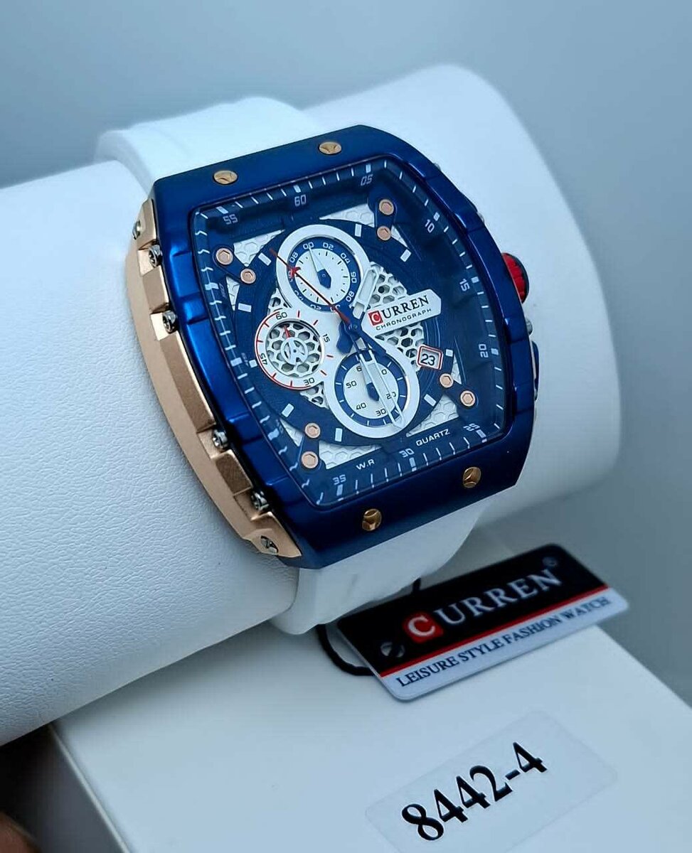 CURREN 8442. Montre à quartz pour homme au design exclusif de cadran bleu, bracelet confortable en silicone blanc et détails rouges et dorés., bleu