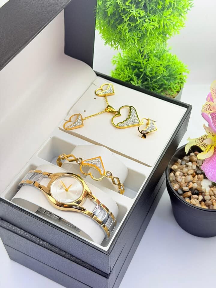 Ensemble élégant de montre et bijoux en or, idéal pour les femmes qui aiment les accessoires raffinés. Bracelet et boucles d'oreilles en forme de cœur ajoutent une touche de romantisme.