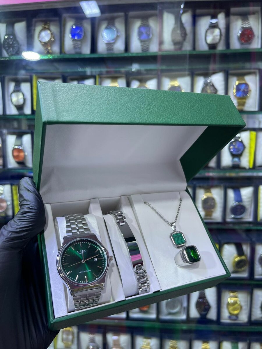 Ensemble chic comprenant une montre en acier inoxydable vert émeraude et un collier assorti. Idéal pour les occasions spéciales, cet ensemble ajoute une touche de sophistication à n'importe quelle tenue.
