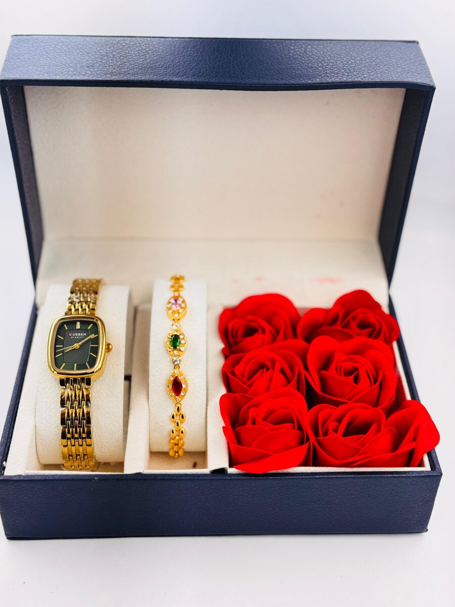 Cadeau élégant pour elle : montre et bracelet en or avec roses rouges. Parfait pour la Saint-Valentin ou anniversaire.