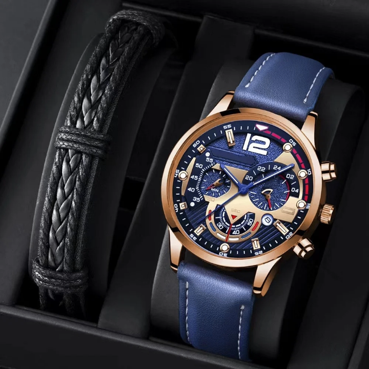 Découvrez cette montre de luxe pour homme, conçue pour allier style et fonctionnalité. Avec un bracelet en cuir synthétique raffiné et un cadran complexe, elle est parfaite pour chaque occasion. Accompagnée d'un bracelet en cuir tressé, cet ensemble apporte une touche sophistiquée à votre poignet. Idéal pour les cadeaux ou pour sublimer votre propre style.
