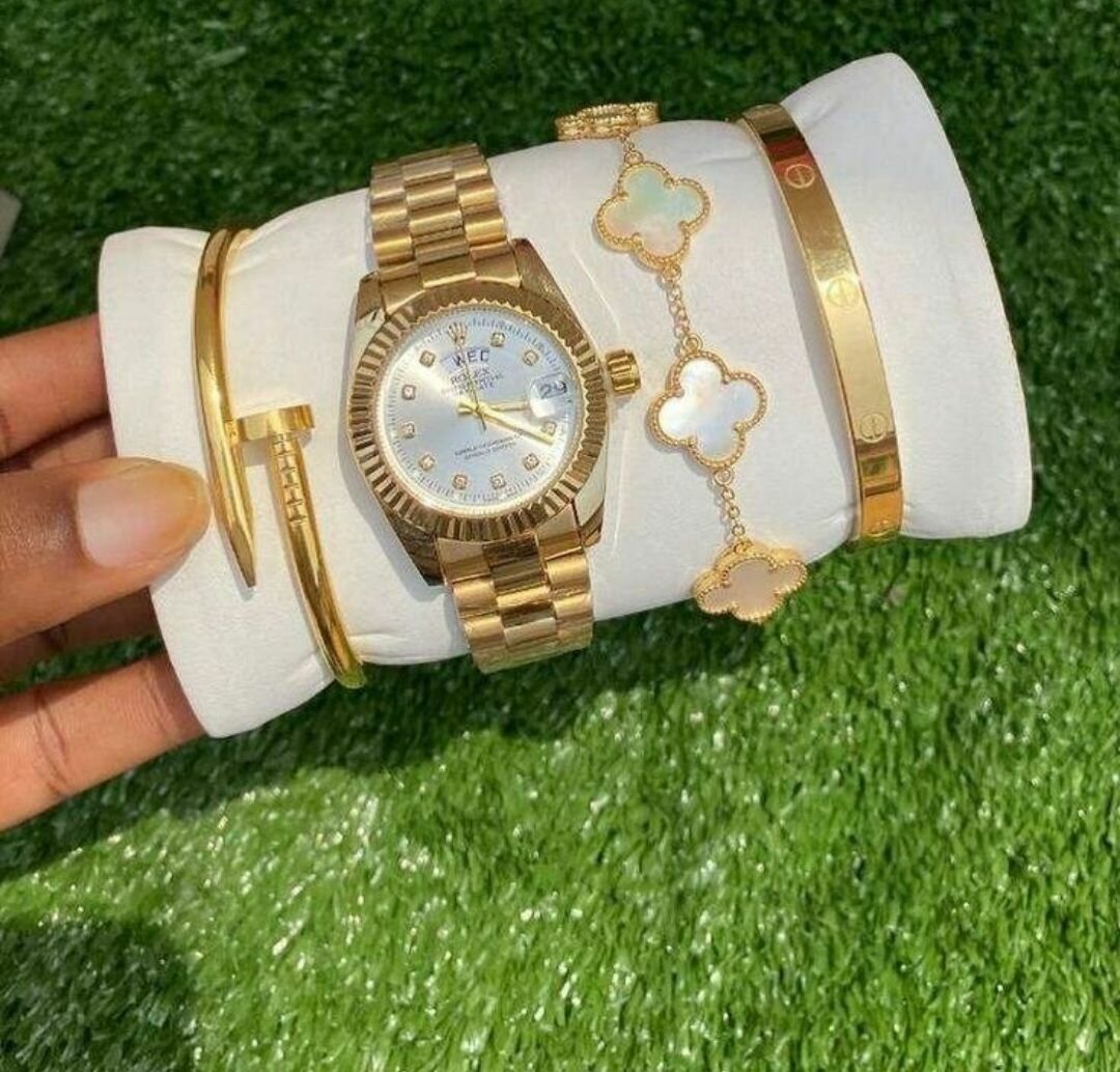 Sublimez votre poignet avec cette montre en or intemporelle accompagnée de bracelets élégants. Parfaite pour toutes les occasions, elle incarne le luxe et la sophistication. Le design raffiné et les matériaux de qualité en font un choix idéal pour ceux qui apprécient le style et l'élégance durable.