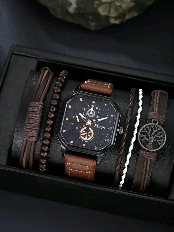 Optez pour cette montre élégante pour hommes accompagnée de bracelets en cuir et perles. Idéale pour une touche de style au quotidien ou en soirée. Bracelet ajustable et design moderne.
