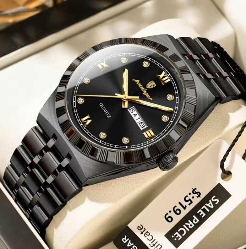 Élégante montre homme, bracelet noir en acier inoxydable. Mouvement quartz précis, affichage date et jour. Parfaite pour toutes occasions.