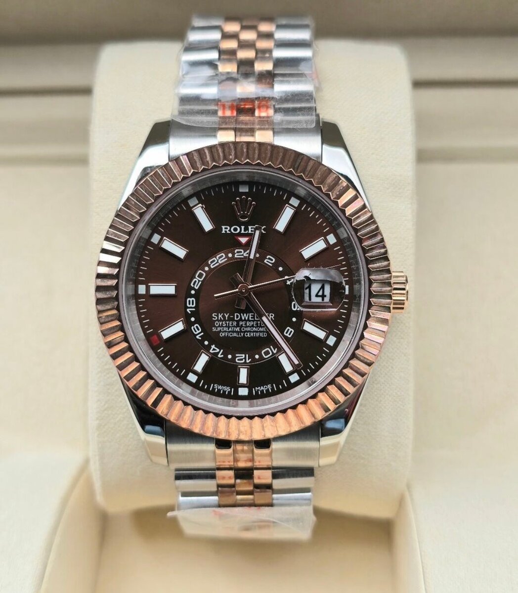 Découvrez la montre Rolex Sky-Dweller pour homme. Un design élégant avec un bracelet bicolore et un cadran sophistiqué. Idéale pour les amateurs de luxe intemporel.