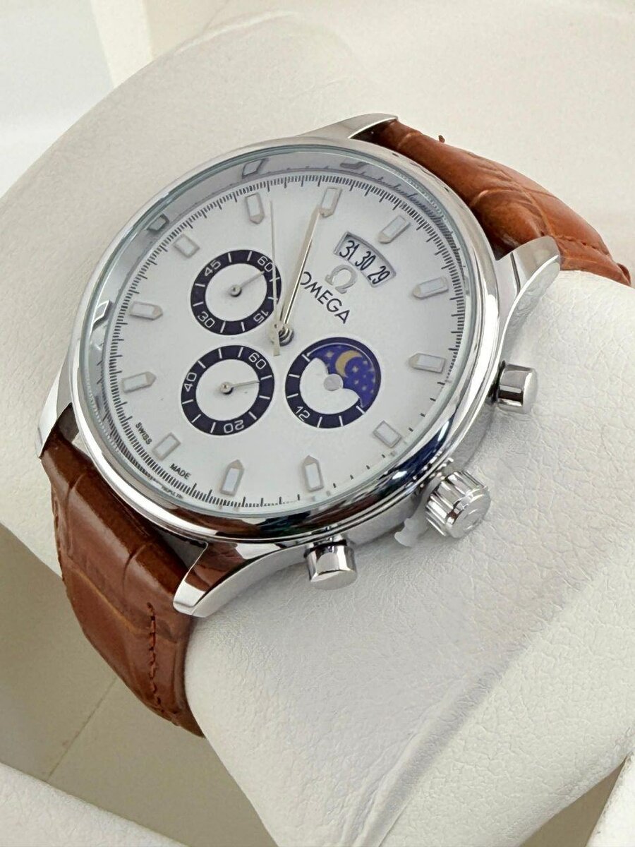Montre Omega pour homme avec bracelet en cuir marron. Design élégant avec affichage de la phase lunaire. Parfaite pour un style sophistiqué et moderne. Un choix idéal pour les amateurs d'horlogerie de qualité.