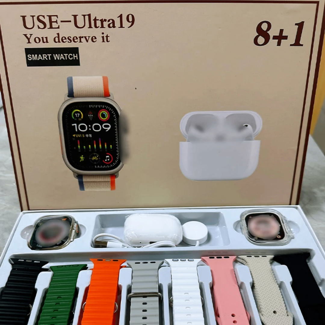 USE-ULTRA 19 8+1 est un ensemble haut de gamme qui allie performance et confort. Il comprend : 1 montre intelligente, 1 écouteur Bluetooth de dernière génération, 1 silicone de protection pour la montre, 7 bracelets interchangeables multicolore, 1 câble USB pour la charge. Vous pouvez recevoir des appels téléphoniques, géré vos conversations, géré vos agendas, suivre votre état de santé, visualisé en temps réel vos performances sportives...