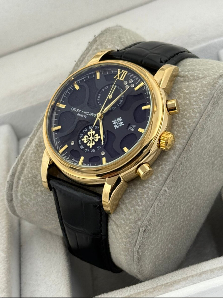 Découvrez cette montre Patek Philippe élégante, avec un cadran noir et un boîtier en or. Parfaite pour les occasions spéciales, elle combine sophistication et style.