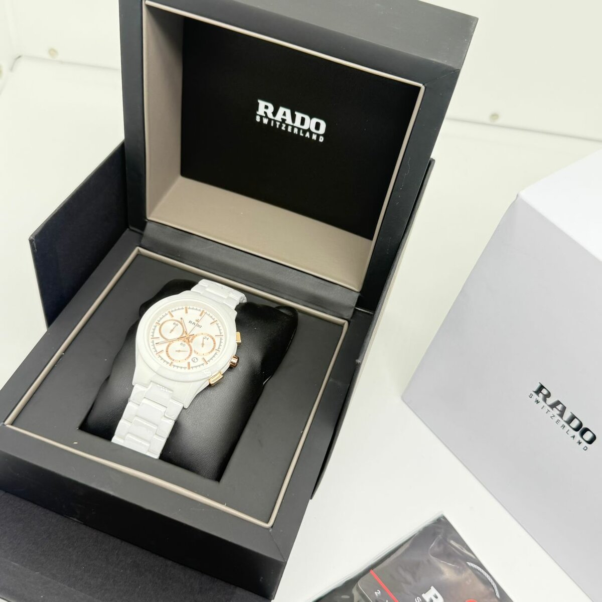 Découvrez l'élégance de la montre chronographe Rado. Avec son design raffiné, elle est parfaite pour toutes les occasions. Bracelet en céramique blanche et cadran délicatement détaillé, elle allie style et fonctionnalité. Un choix idéal pour les passionnés d'horlogerie.