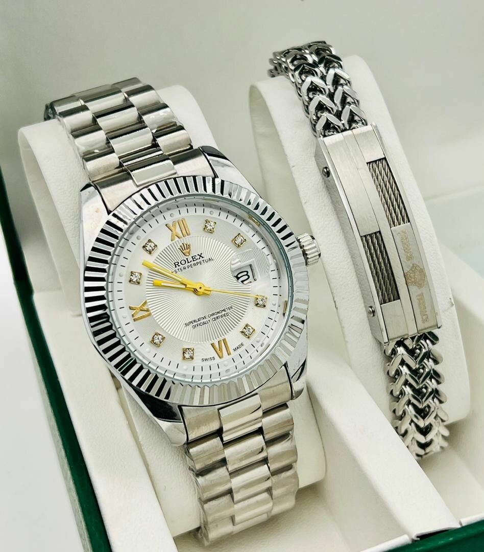Élégante montre Rolex en acier inoxydable avec bracelet assorti. Idéale pour les amateurs de luxe et de style. Parfaite pour toute occasion formelle ou décontractée.