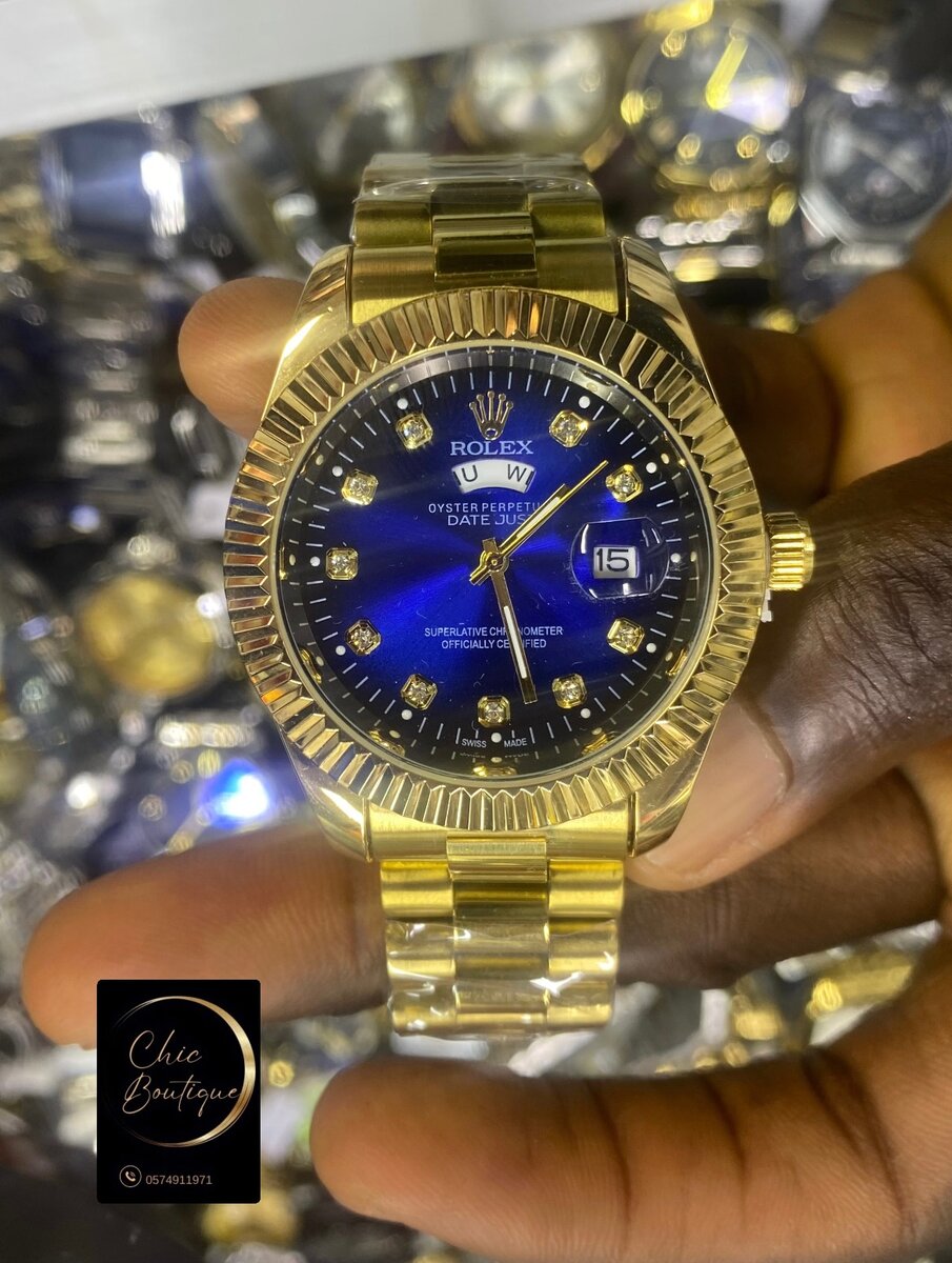 Élégante montre dorée pour homme avec cadran bleu. Idéale pour un look sophistiqué, elle allie style et fonctionnalité. Parfait pour les occasions formelles ou un usage quotidien élégant.