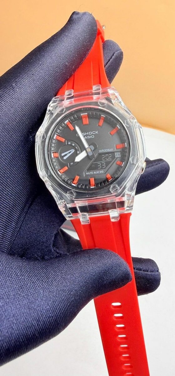 Montre sportive moderne avec bracelet rouge, idéale pour les activités en plein air. Étanche et robuste, elle offre une lecture claire de l'heure grâce à son cadran transparent. Parfaite pour un style actif et audacieux.