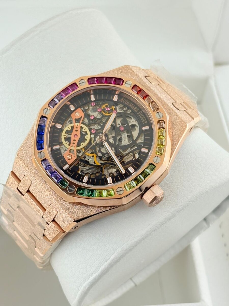 Découvrez une montre squelette élégante avec un boîtier en or rose, ornée de pierres colorées étincelantes. Idéale pour les amateurs de mode et de style sophistiqué. Cette pièce artisanale exceptionnelle s'adapte à toutes les occasions formelles et décontractées, ajoutant une touche de luxe à votre poignet.