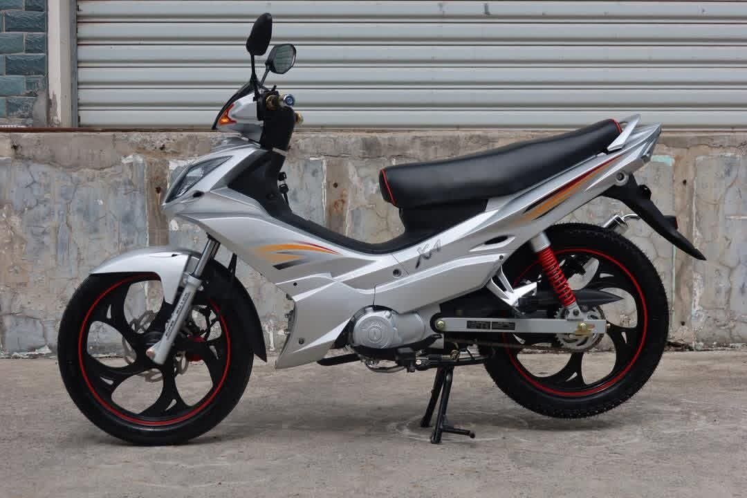 Découvrez ce moto argenté au design élégant et aux finitions soignées, équipé de roues noires à accents rouges. Idéal pour les déplacements urbains, il combine performance et style.
