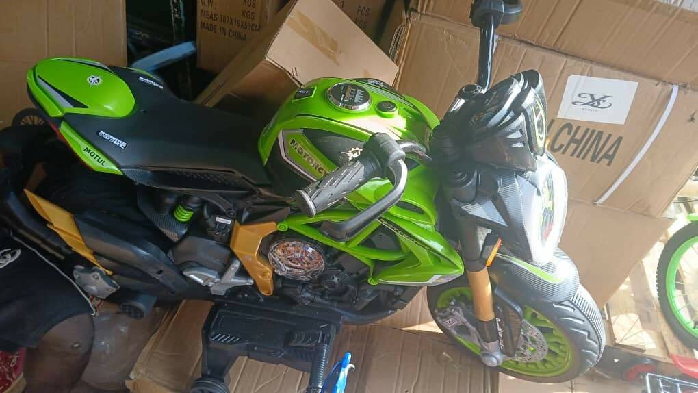Moto électrique verte pour enfants. Idéale pour les jeunes aventuriers, elle offre une expérience de conduite réaliste avec son design attrayant. Convient pour jouer à l'extérieur et développer la motricité.