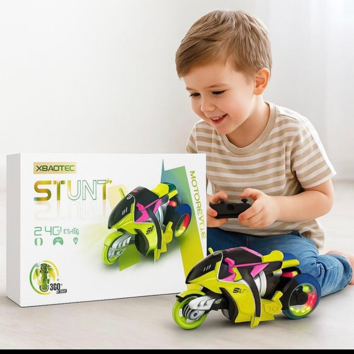 Moto télécommandée avec fonctions acrobatiques et rotation à 360°. Idéale pour les jeunes amateurs de courses et de figures spectaculaires. Télécommande facile à utiliser pour une expérience interactive et amusante.