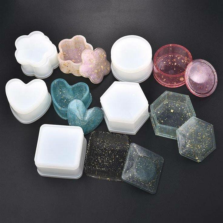 Moules en Silicone pour Boîtes à Bijoux de formes variées et élégantes : Cœur, Fleur, Hexagone, Rond, et Carré, pour laisser libre cours à votre créativité !