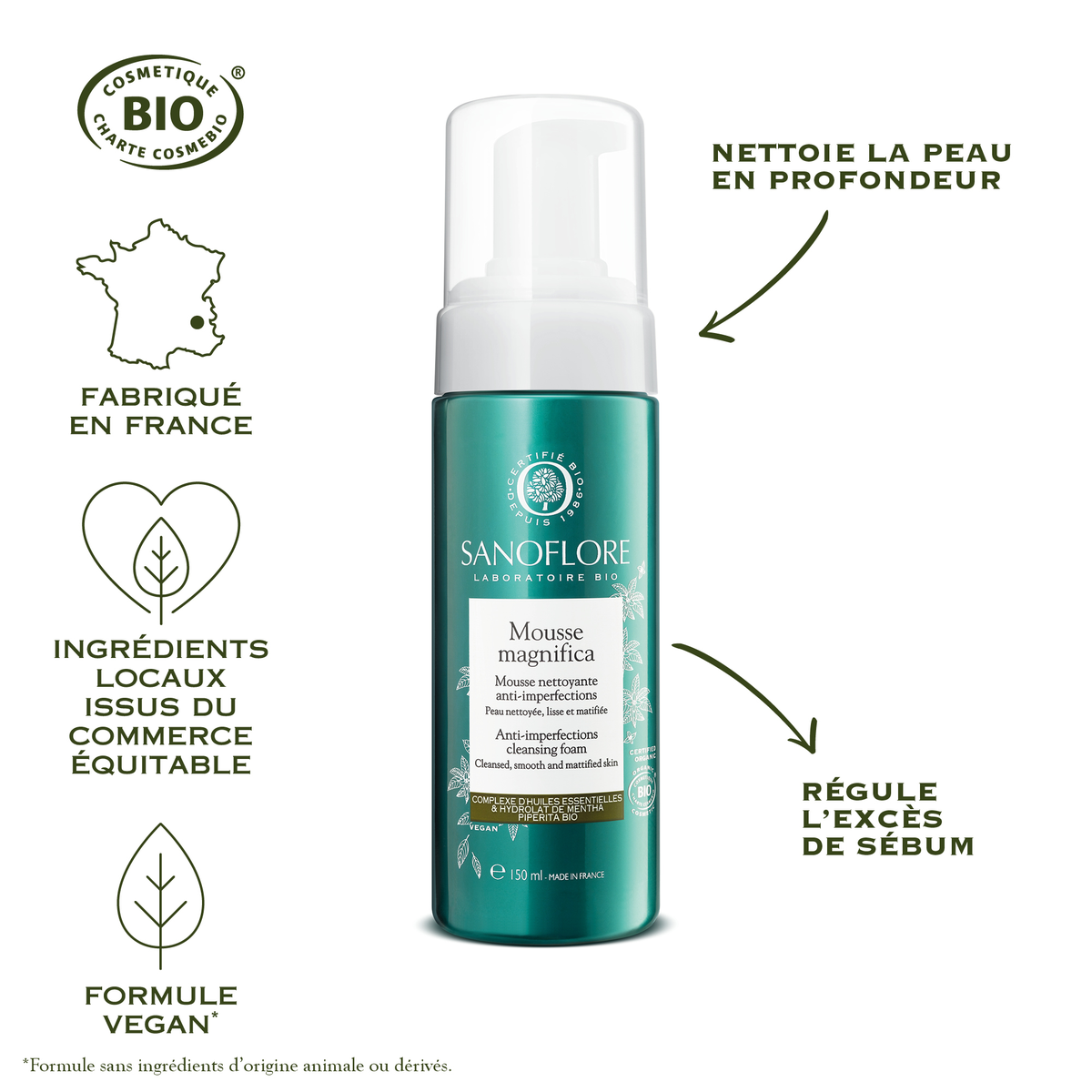 Découvrez la mousse nettoyante magnifica de SANOFLORE, idéale pour nettoyer et réguler l'excès de sébum. Produit vegan et certifié bio, fabriqué en France avec des ingrédients locaux issus du commerce équitable.